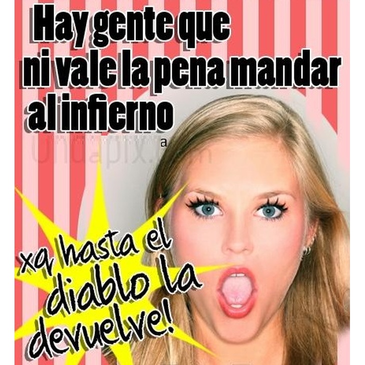 Otra que es picante dice: «Te insultaría pero la verdad que no lo haría tan bien como lo hizo contigo la naturaleza» Uuuuh!. Aunque hay imágenes que tienen un tono más pesimista porque dicen que «la traición nunca proviene de tus enemigos». Y que dicen «para mí tú no existes» y «esa gente no vale la pena mandarla al infierno porque el mismo Satanás se va a encargar de devolverla». Hay mujeres que son verdaderamente envidiosas. Es cierto, y son complicadas, por eso, también hay unas frases para insultar a esas mujeres que te roban los novios, jeje y usarlas para indicar que tengan un poco de respeto.